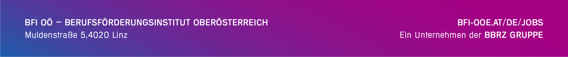 Das BFI Oberösterreich ist Teil der renommierten BBRZ GRUPPE und zählt zu den bedeutendsten Bildungsanbietern im Land. Wir stehen für attraktive Angebote, fundierte Pädagogik, hohe Qualität und kontinuierliche Innovation. Mitarbeitende gestalten ihr Arbeitsgebiet mit hohem Engagement und in Eigenverantwortung. Die Grundsätze unseres Verständnisses basieren auf Wertschätzung, Sicherheit und langfristiger Perspektive. Arbeiten am BFI Oberösterreich heißt, sich ambitionierten Anforderungen zu stellen und die eigenen Potenziale zu entwickeln.
